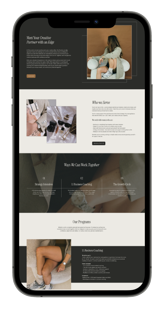 A completely custom Squarespace website that reflects your brand and supports your goals, so you can attract and book aligned clients, grow your business and have the luxury of knowing your website is selling for you 24/7.Mobile Optimisation